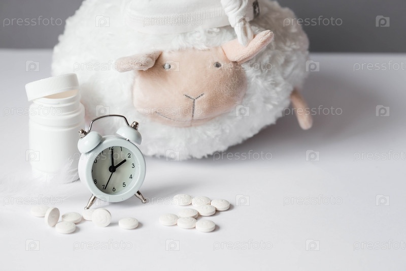 Тюбик с таблетками, овца в шапочке для сна и будильник. Время на часах 2 часа ночи. Бессонница и восстановление режима сна. Считай овец, чтобы заснуть