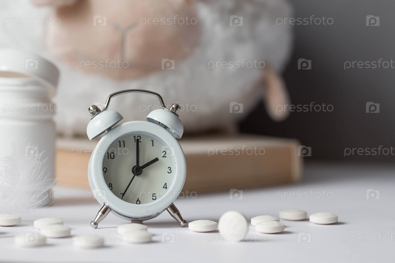 Тюбик с таблетками, овца в шапочке для сна и будильник. Время на часах 2 часа ночи. Бессонница и восстановление режима сна. Считай овец, чтобы заснуть