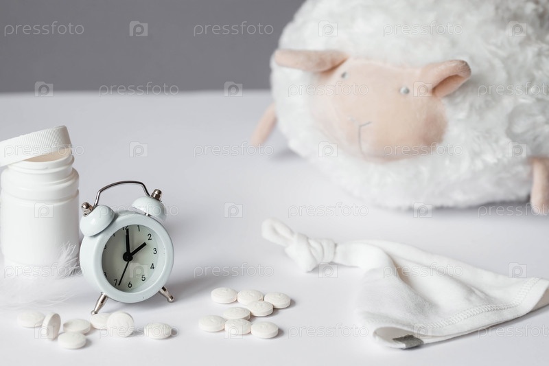 Тюбик с таблетками, овца в шапочке для сна и будильник. Время на часах 2 часа ночи. Бессонница и восстановление режима сна. Считай овец, чтобы заснуть