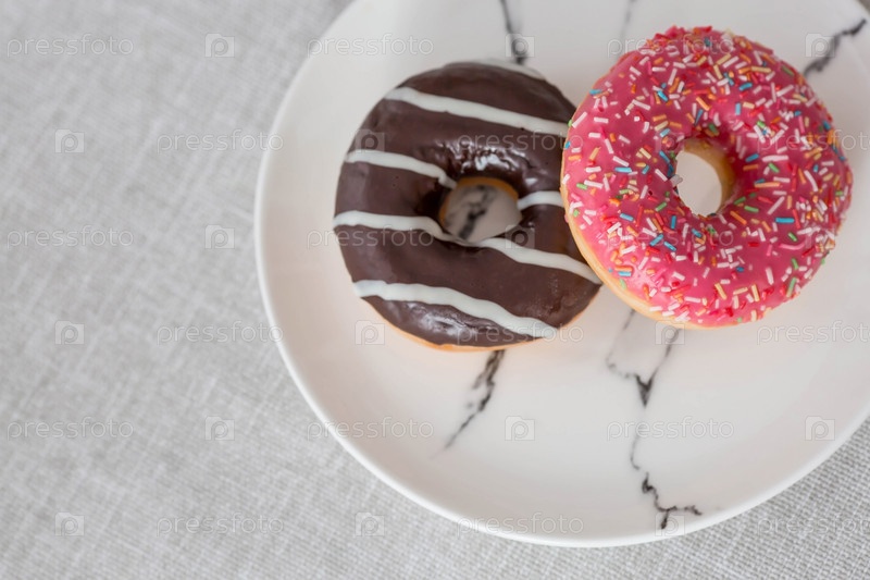 Вкусный десерт. Розовый и шоколадный пончик с разноцветными брызгами, чашка черного кофе или чая. Сладости