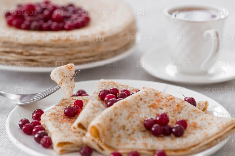 Русские традиции. Русский праздник Масленица. Натюрморт с чашкой чая, стопка блинов с северной клюквой, кубики масла на столе