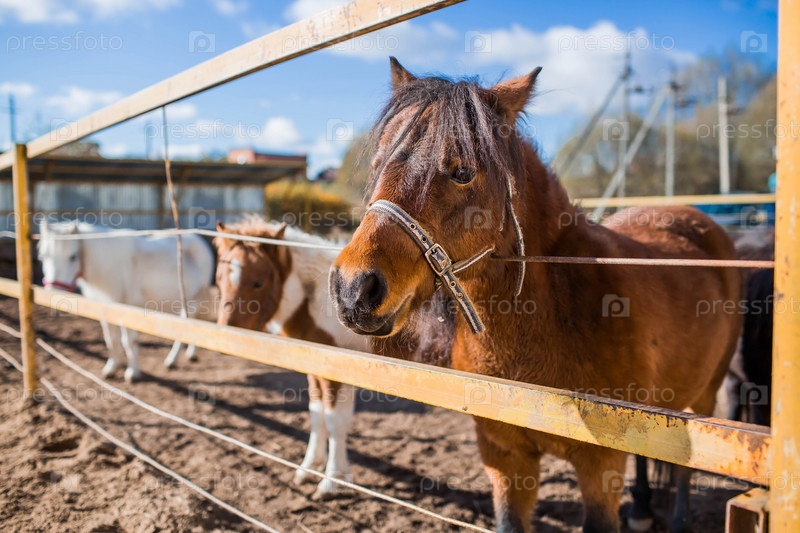 Порода декоративных карликовых лошадей. Милый маленький мини-пони на ферме. Крупный план портрета животного