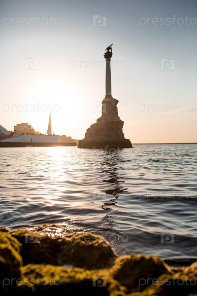 Красивый морской пейзаж. Памятник затонувшим кораблям на закате. Россия, Крым, Севастополь, октябрь