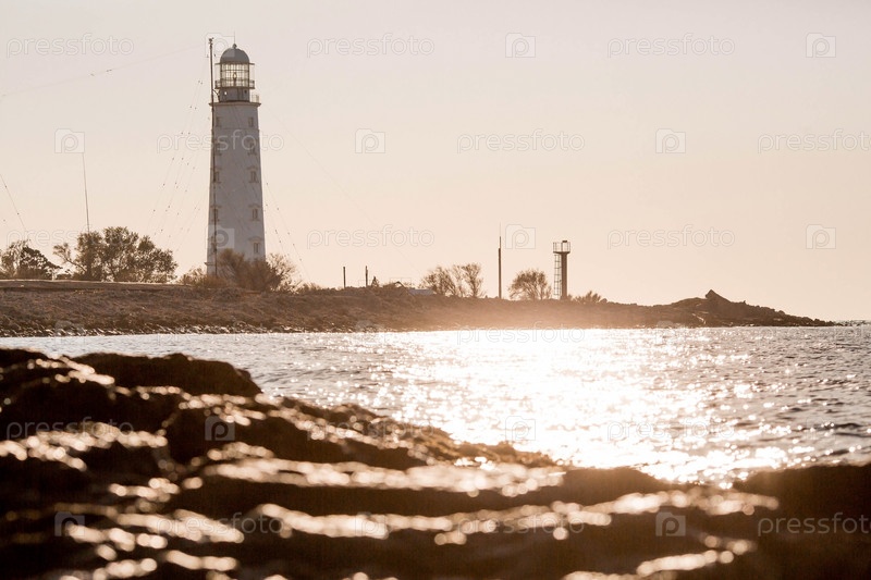 Морской пейзаж с красивым белым Херсонским маяком на фоне голубого неба. Крым, Севастополь, мыс Херсонес