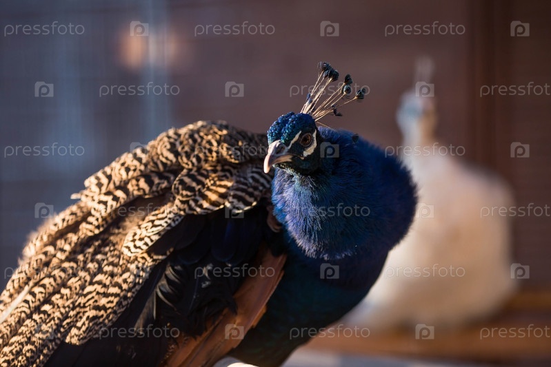 Портрет красивого павлина с перьями. Индийский или голубой павлин. Павлин - павлин с закрытым хвостом, красивый представительный образец самца павлина в больших металлических цветах