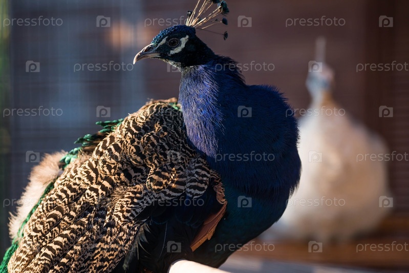 Портрет красивого павлина с перьями. Индийский или голубой павлин. Павлин - павлин с закрытым хвостом, красивый представительный образец самца павлина в больших металлических цветах