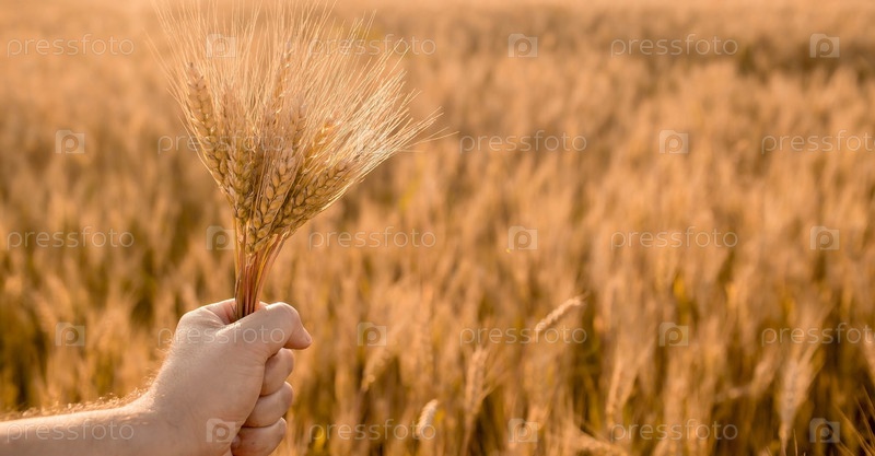 Мужчина держит золотые колосья пшеницы на фоне созревающего поля. Руки фермера крупным планом. Концепция посадки и сбора богатого урожая. Сельский пейзаж на закате