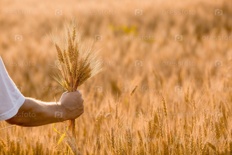Мужчина держит золотые колосья пшеницы на фоне созревающего поля. Руки фермера крупным планом. Концепция посадки и сбора богатого урожая. Сельский пейзаж на закате