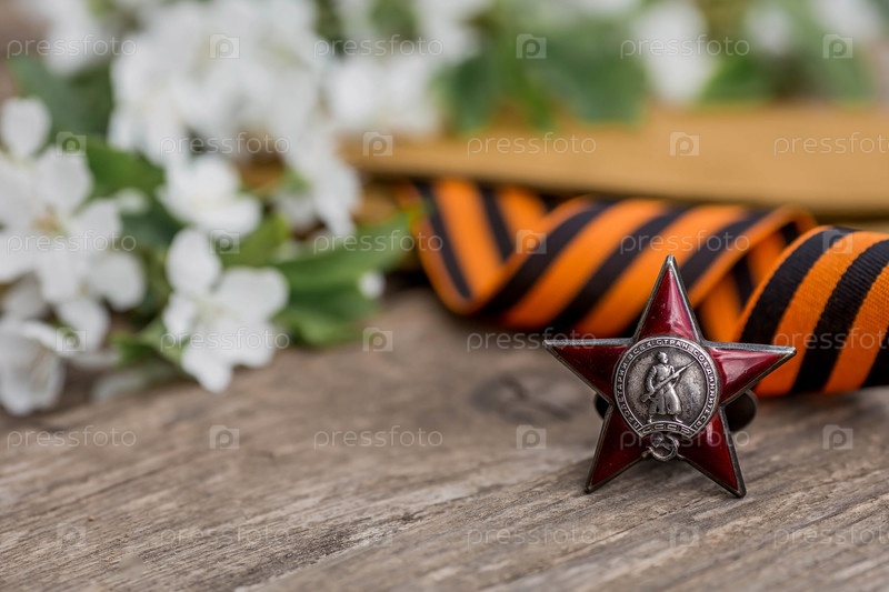Георгиевская лента и орден Красной Звезды ветерана Великой Отечественной войны СССР на деревянном фоне. Перевод на русский язык: Рабочие всех стран объединяйтесь. Концепция праздника 9 мая