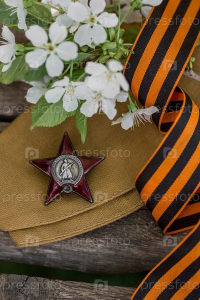 Георгиевская лента и орден Красной Звезды ветерана Великой Отечественной войны СССР на деревянном фоне. Перевод на русский язык: Рабочие всех стран объединяйтесь. Концепция праздника 9 мая