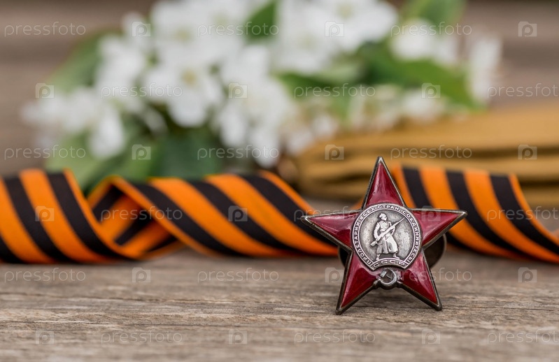 Георгиевская лента и орден Красной Звезды ветерана Великой Отечественной войны СССР на деревянном фоне. Перевод на русский язык: Рабочие всех стран объединяйтесь. Концепция праздника 9 мая