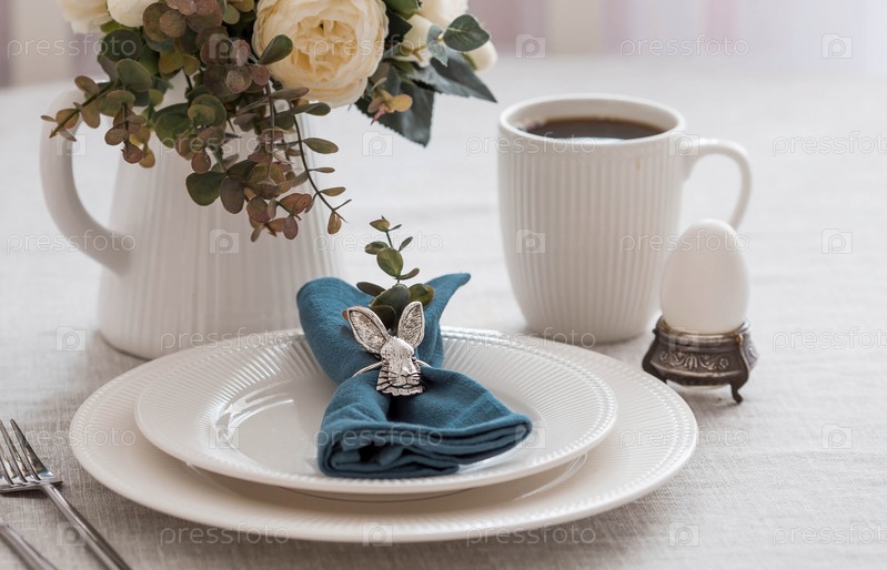 Красивая весенняя сервировка стола. Тарелка с хлопковой салфеткой с зайчиком. Столовое серебро и ваза с цветами на льняной скатерти. Концепция праздничной сервировки и яркого праздника Пасхи