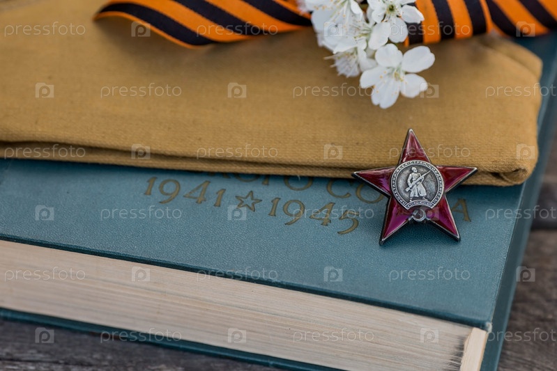 Георгиевская лента и орден Красной Звезды ветерана Великой Отечественной войны СССР на деревянном фоне. Перевод на русский язык: Рабочие всех стран объединяйтесь. Концепция праздника 9 мая