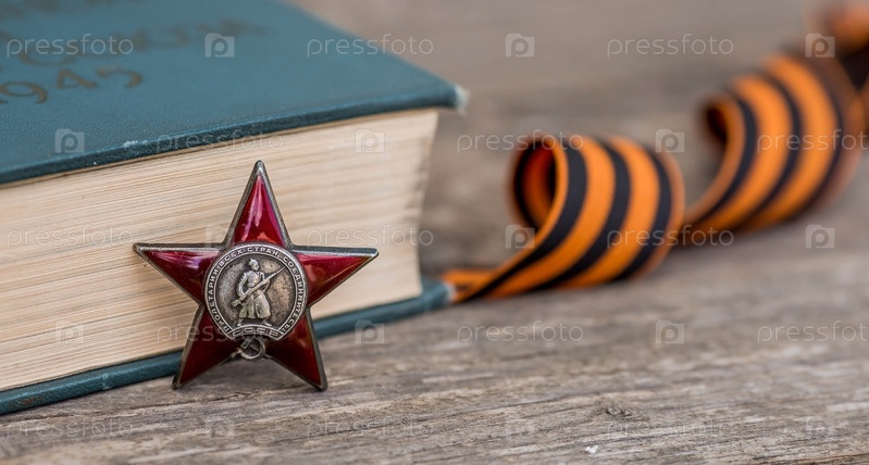 Георгиевская лента и орден Красной Звезды ветерана Великой Отечественной войны СССР на деревянном фоне. Перевод на русский язык: Рабочие всех стран объединяйтесь. Концепция праздника 9 мая