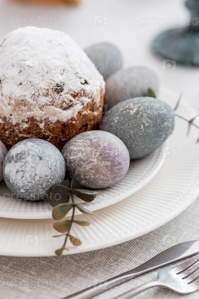 Весенняя сервировка стола. Тарелка с хлопковой салфеткой с зайчиком, тортом и пасхальными яйцами. Столовое серебро, пасхальные кролики и ваза с цветами на льняной скатерти. Концепция светлого праздника Пасхи