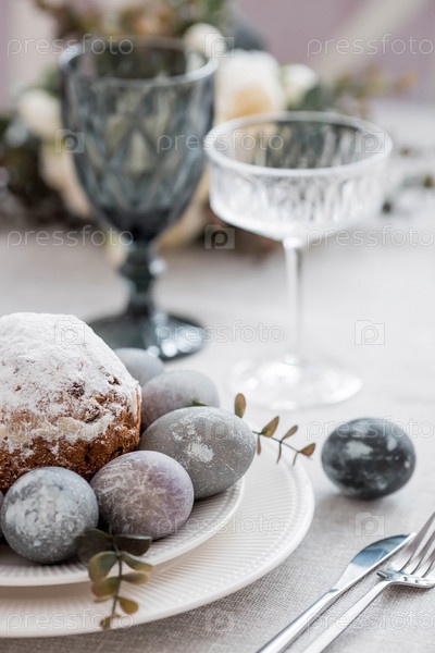 Весенняя сервировка стола. Тарелка с хлопковой салфеткой с зайчиком, тортом и пасхальными яйцами. Столовое серебро, пасхальные кролики и ваза с цветами на льняной скатерти. Концепция светлого праздника Пасхи