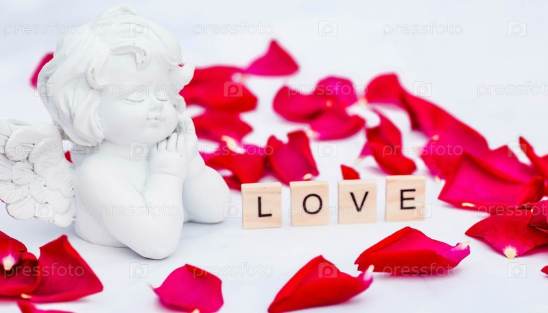 Слово «Любовь» и милый ангел на белом мраморном фоне. Любовь на деревянных кубиках. Тема любви. День святого Валентина. Деревянные блоки со словом любовь. Положительные эмоции