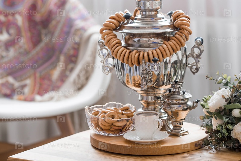 Русские традиции. Чаепитие с самоваром. Натюрморт с бубликами, баранками и русскими самоварами в интерьере современной гостиной. Русская культура