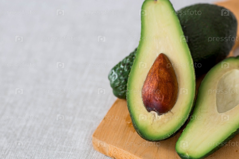 Спелый вкусный авокадо на разделочной доске на льняной скатерти. Крупный план. Светлый фон. Вегетарианская еда. Здоровый образ жизни