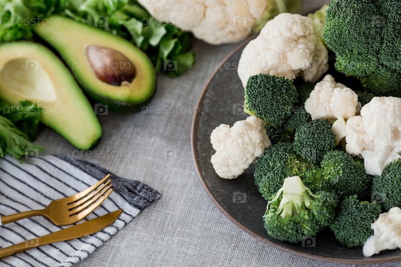 Свежая зеленая брокколи, цветная капуста и авокадо на тарелке на льняной скатерти. Капустные листья брокколи. Светлый фон. Вегетарианская еда. Здоровый образ жизни
