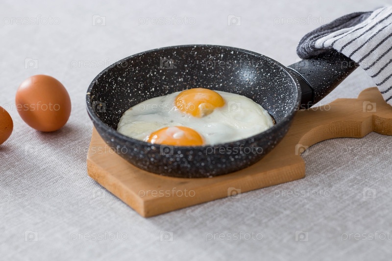 Жареные яйца на сковороде и куриные яйца на льняной скатерти. Завтрак обед и ужин. Взгляд мягкий, выборочный фокус. Деревенский стиль