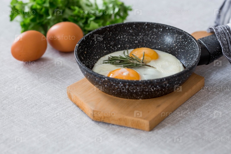 Жареные яйца в сковороде с розмарином, хлебом, яйцами и зеленым салатом на льняной скатерти. Завтрак обед и ужин. Взгляд мягкий, выборочный фокус. Деревенский стиль