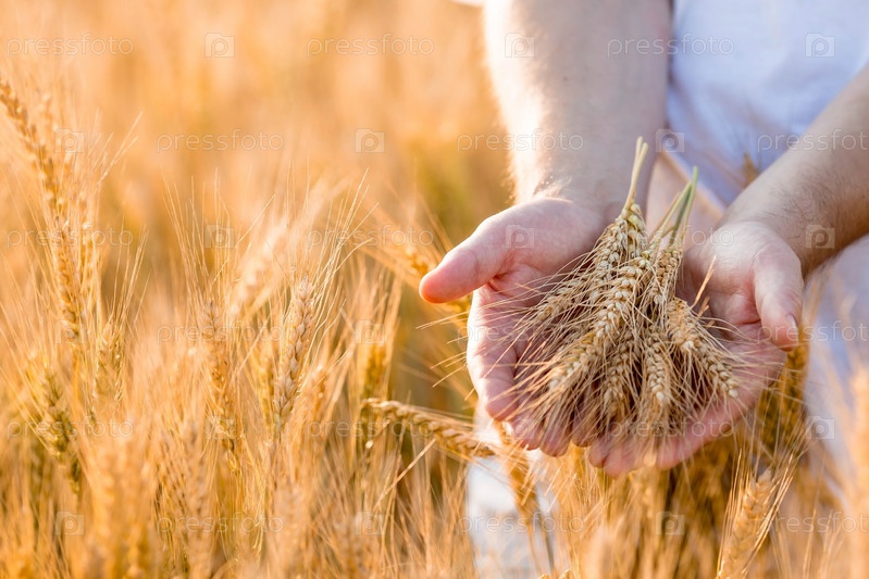Мужчина держит золотые колосья пшеницы на фоне созревающего поля. Руки фермера крупным планом. Концепция посадки и сбора богатого урожая. Сельский пейзаж на закате