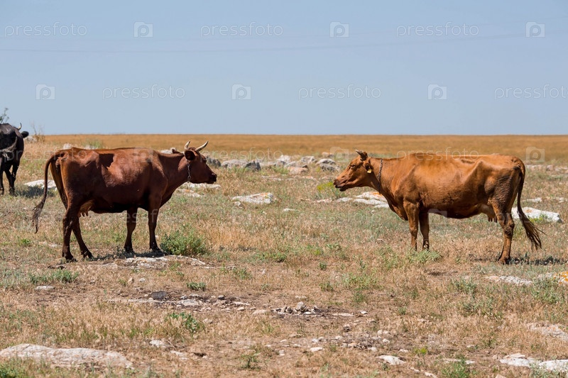 В поле пасется много коров. Крым, Россия