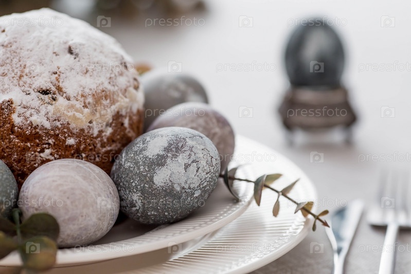 Весенняя сервировка стола. Тарелка с хлопковой салфеткой с зайчиком, тортом и пасхальными яйцами. Столовое серебро, пасхальные кролики и ваза с цветами на льняной скатерти. Концепция светлого праздника Пасхи