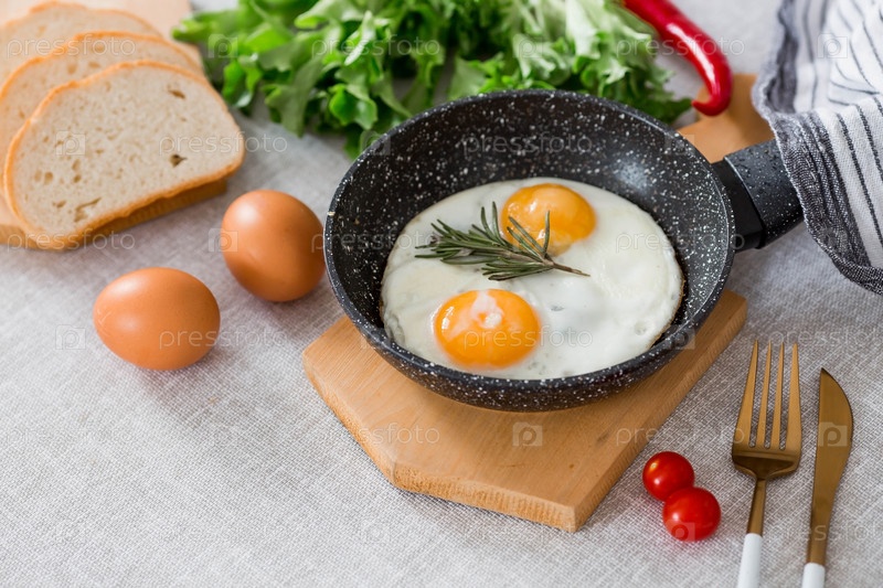 Жареные яйца в сковороде с розмарином, хлебом, яйцами и зеленым салатом на льняной скатерти. Завтрак обед и ужин. Взгляд мягкий, выборочный фокус. Деревенский стиль