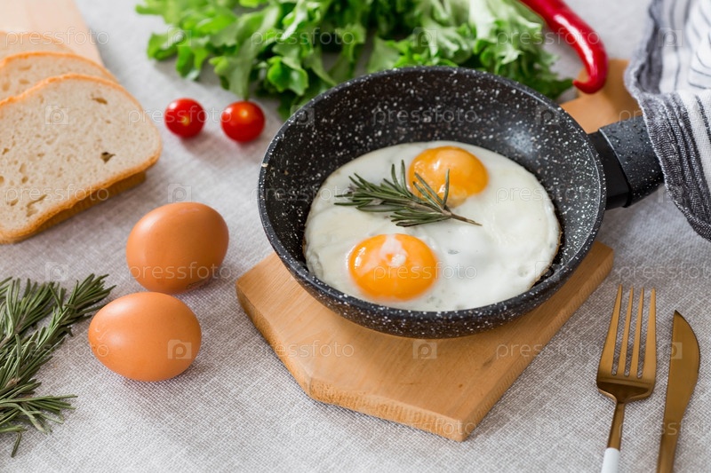 Жареные яйца в сковороде с розмарином, хлебом, яйцами и зеленым салатом на льняной скатерти. Завтрак обед и ужин. Взгляд мягкий, выборочный фокус. Деревенский стиль