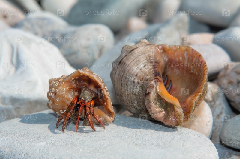 Краб-отшельник выползает из раковины на берегу