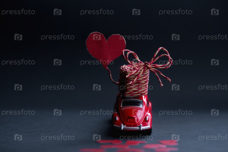 Москва, Россия - январь 2020 г.: Доставка красного ретро игрушечного автомобиля