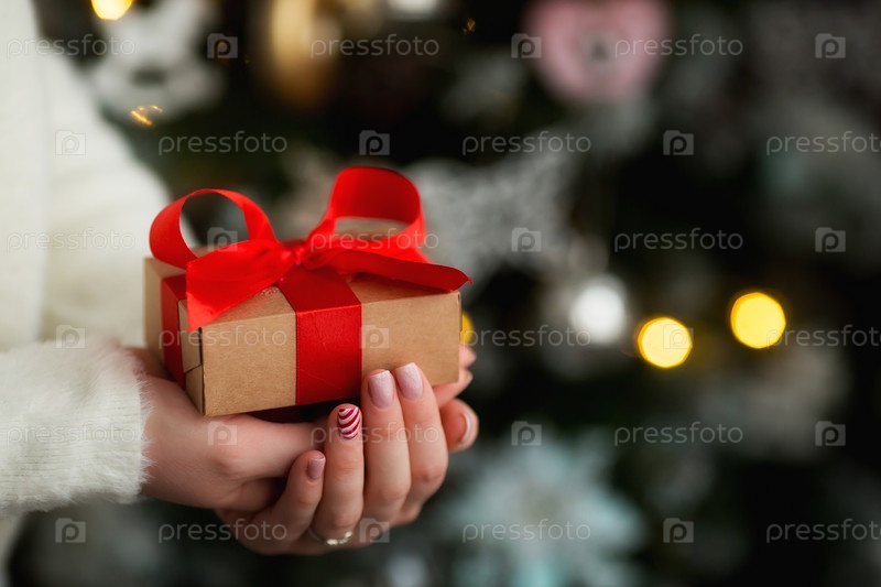 Крупный план женских рук, держащих небольшой подарок, завернутый в красную ленту. Небольшой подарок в руках женщины в помещении. Малая глубина резкости с акцентом на маленьком поле