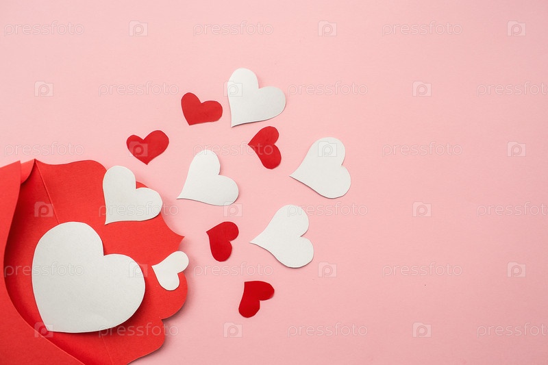 Красный конверт и белые сердца на розовом фоне. Концепция любви. Концепция Дня святого Валентина. Концепция дня матери. Плоская укладка