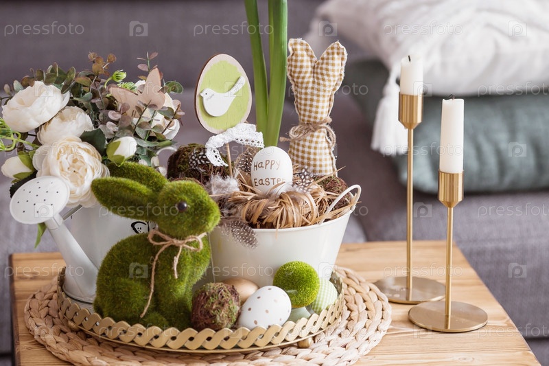 Деревенский. Бело-зеленые цвета. Железные кашпо с пасхальными яйцами, цветами, свечами и кроликами в интерьере гостиной на столе. Концепция домашнего уюта в светлый праздник Пасхи 2023