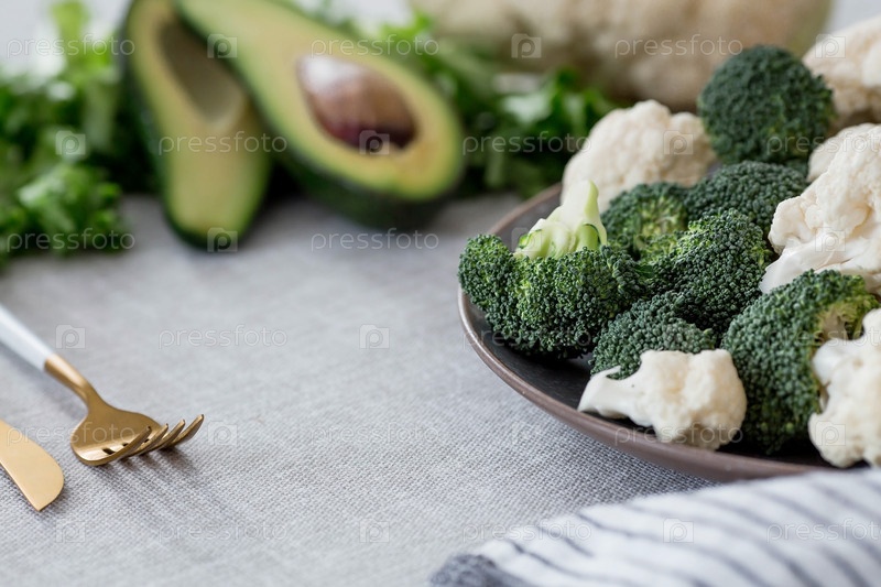 Свежая зеленая брокколи, цветная капуста и авокадо на тарелке на льняной скатерти. Капустные листья брокколи. Светлый фон. Вегетарианская еда. Здоровый образ жизни