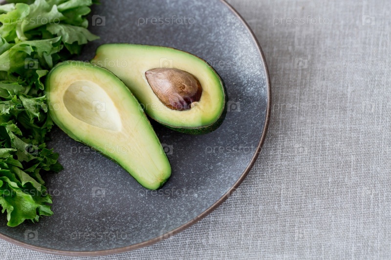 Спелый вкусный авокадо на тарелке на льняной скатерти. Крупный план. Светлый фон. Вегетарианская еда. Здоровый образ жизни