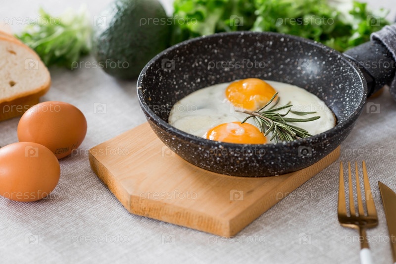 Жареные яйца в сковороде с розмарином, хлебом, яйцами и зеленым салатом на льняной скатерти. Завтрак обед и ужин. Взгляд мягкий, выборочный фокус. Деревенский стиль