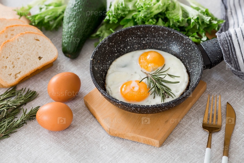 Жареные яйца в сковороде с розмарином, хлебом, яйцами и зеленым салатом на льняной скатерти. Завтрак обед и ужин. Взгляд мягкий, выборочный фокус. Деревенский стиль
