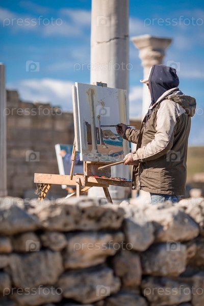 Художник рисует картину среди руин древнего города.Крым, Херсонес, Октябрь