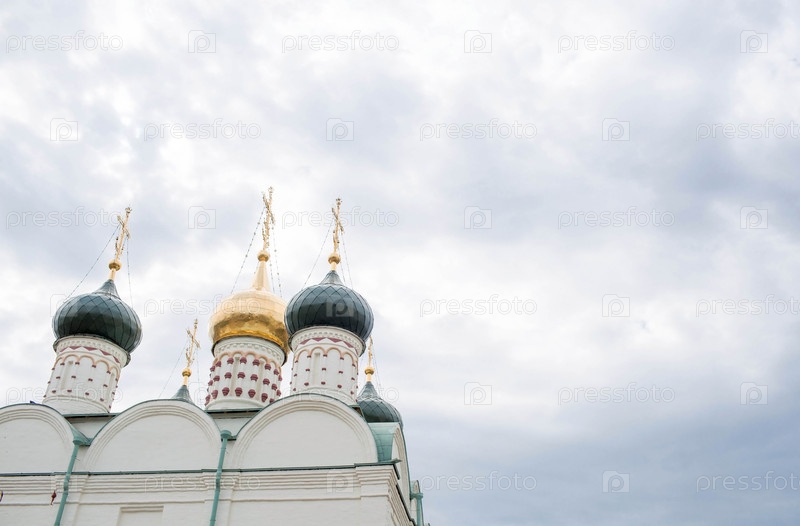 Территория Зарайского кремля. Зарайский кремлевский ансамбль. Никольский собор, 1681 год. Православный крест и купола крупным планом. Зарайский Кремль, Россия