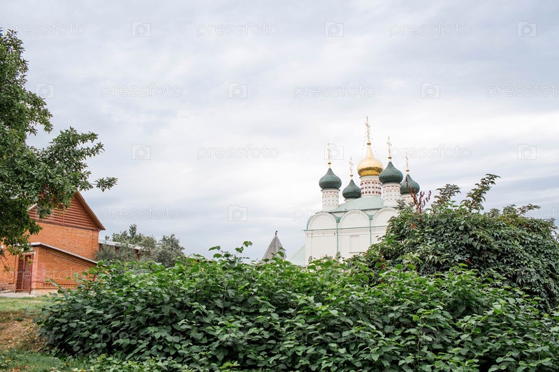 Территория Зарайского Кремля. Зарайский кремлевский ансамбль. Никольский собор, 1681 год. Православный крест и купола крупным планом. Зарайский Кремль, Россия