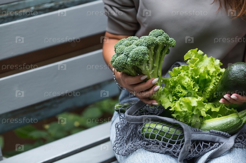 Женские руки с авоськой и зелеными овощами крупным планом. Девушка покупает еду. Концепция здорового питания, вегетарианства и экологии. Отказ от полиэтиленовых пакетов