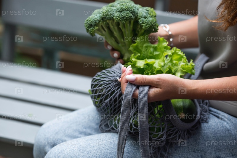 Женские руки с авоськой и зелеными овощами крупным планом. Девушка покупает еду. Концепция здорового питания, вегетарианства и экологии. Отказ от полиэтиленовых пакетов