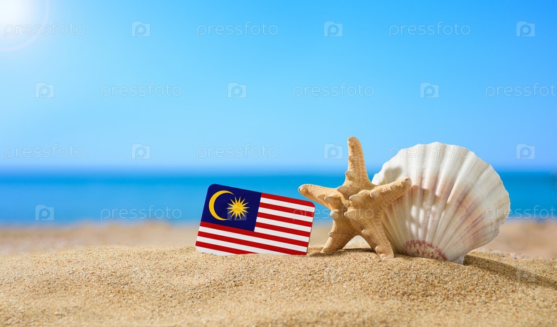 Тропический пляж с ракушками и флагом Малайзии. Концепция райского отдыха на пляжах Малайзии