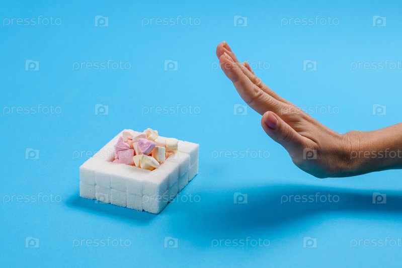 Концепция отказа от сладостей и сахара. Рука и сладости на синем фоне