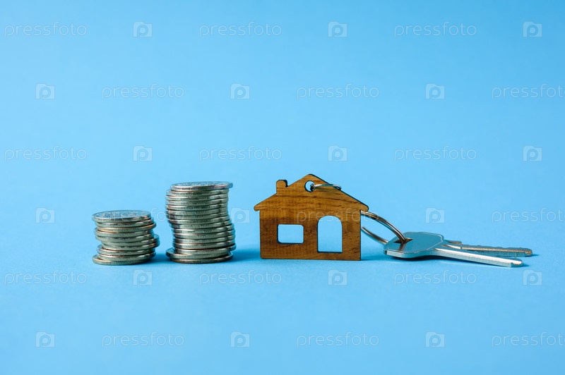 Монеты, ключи и небольшой деревянный дом на синем фоне. Новая концепция покупки жилья
