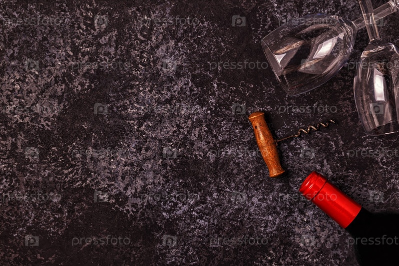 Вино, бокалы, виноград и штопор на каменном фоне