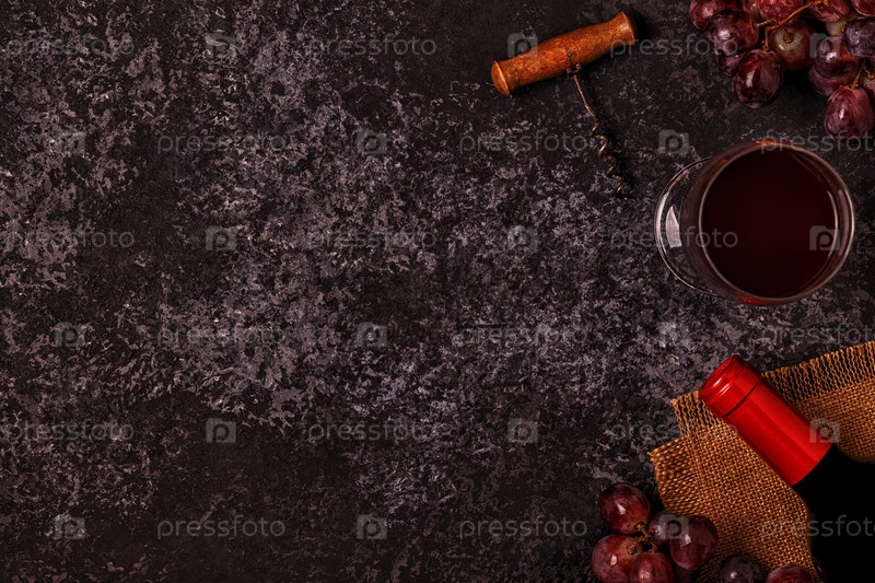 Вино, бокалы, виноград и штопор на каменном фоне